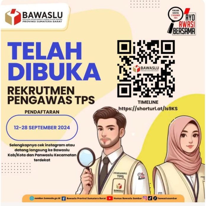Ketua Bawaslu Sumbar Alni mengatakan, rekrutmen Pengawas TPS sudah dimulai sejak 12 September dan akan berlangsung sampai dengan 28 September 2024. Perekrutan ini dilakukan melalui Panitia Pengawas Pemilihan Umum Kecamatan (Panwascam) di masing-masing kecamatan.