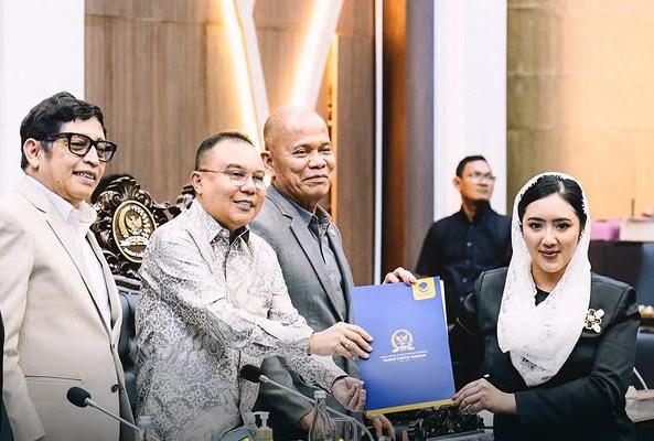 Anggota DPR RI Fraksi Nasdem Cindy Monica bersama Wakil Ketua DPR RI Sufmi Dasco Ahmad setelah pembahasan RUU Perlindungan Pekerja Rumah Tangga (PPRT) di Gedung DPR RI,senin 20/4/26.(foto:dok)