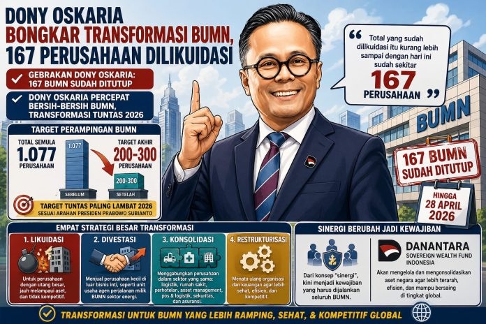 Jakarta,92news.id – Kepala BP BUMN sekaligus COO Danantara, Dony Oskaria, menegaskan langkah besar pemerintah dalam merombak struktur badan usaha milik negara terus berjalan agresif. Hingga 28 April 2026, sebanyak 167 perusahaan pelat merah telah resmi dilikuidasi dalam satu tahun terakhir.
