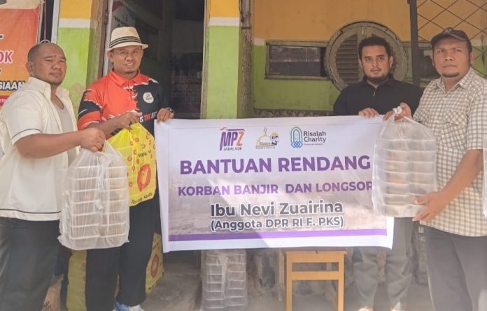 Nevi Zuairina bersama MPZ Jabal Nur dan Khaira Aqiqah serahkan bantuan kemanusiaan berupa paket rendang, sembako, dan pakaian layak pakai kepada warga korban banjir bandang di Jorong Labueh Maninjau, Kabupaten Agam, Sabtu 20/12/25.(foto:dok)