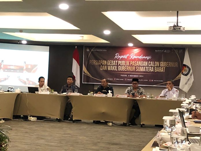 PADANG,92news.id –Jelang dimulainya Pilkada Serentak Tahun 2024 Komisi Pemilihan Umum Provinsi Sumatera Barat menggelar Rapat Koordinasi Persiapan Debat Publik Pasangan Calon Gubernur dan Wakil Gubernur Sumatera Barat, di Mercure Hotel, Padang, Senin 4 November 2024.